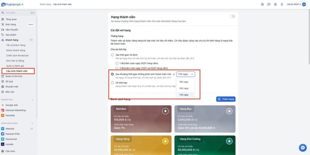 Sau cập nhật này, Haravan hỗ trợ làm mới hạng thành viên nếu khách không có giao dịch mới trong các mốc thời gian: