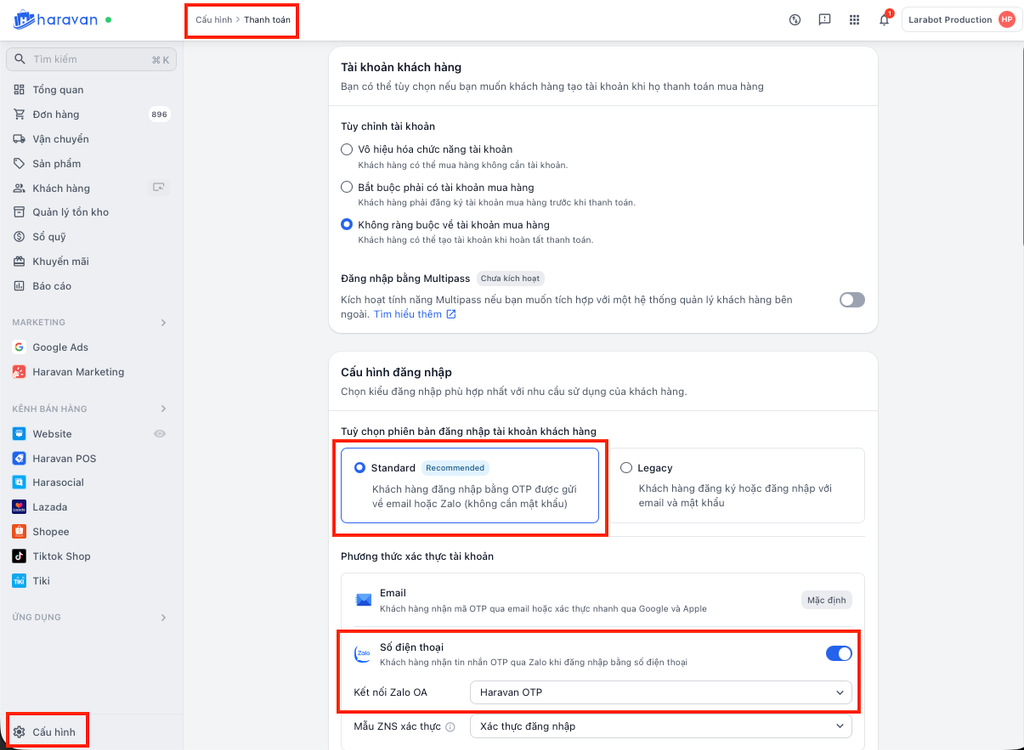 - vào menu Cấu hình trong trang quản trị MyHaravan