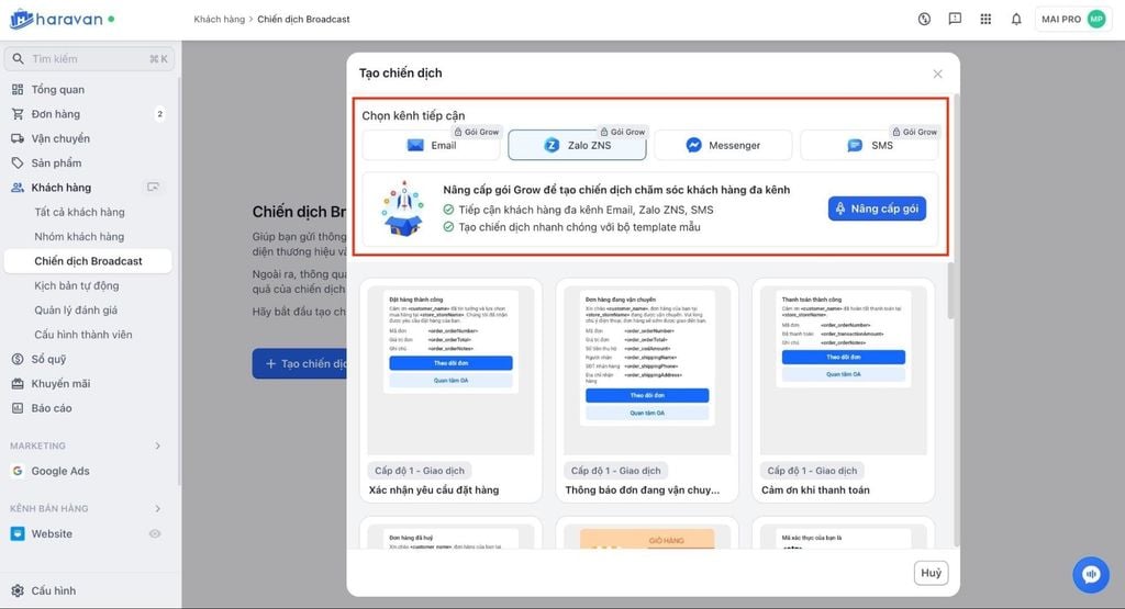 Nếu bạn muốn gửi ZNS với tên riêng của cửa hàng, thay vì hiển thị là Haravan Shop, doanh nghiệp cần nâng cấp lên gói Grow/Scale để sử dụng OA riêng.