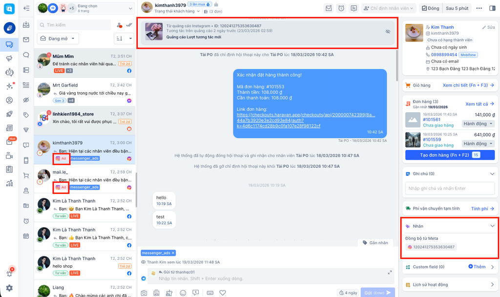 Sau cập nhật, Haravan Social đã có thể nhận diện chính xác hội thoại đến từ quảng cáo Instagram.