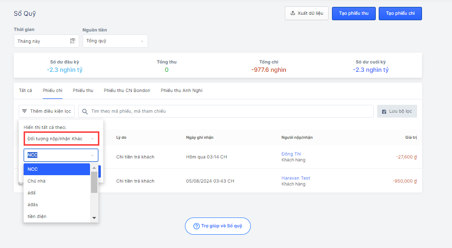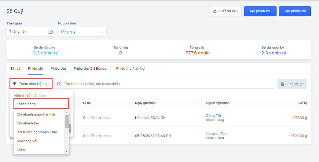 Để lọc phiếu chi hoặc thu với tên người nhận, bạn có thể thực hiện các bước sau: