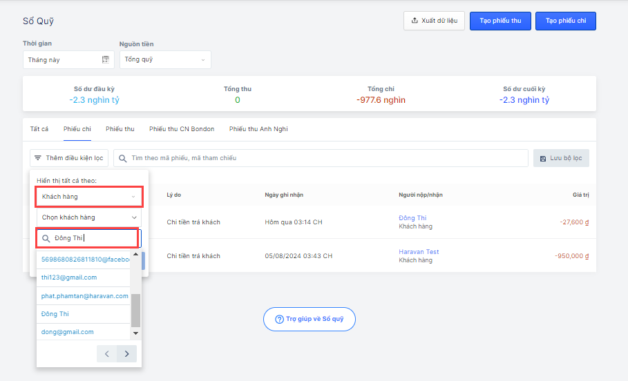 • Đối với khách hàng: Chọn "Khách hàng" vànhập tên khách hàng cần lọc.