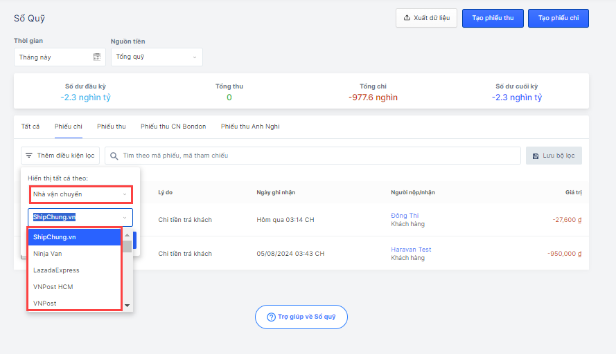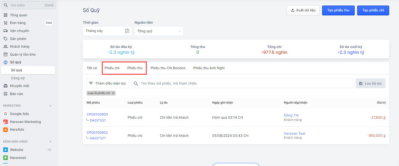 - Vào mục Sổ quỹ, bạn chọn phiếu chi hoặc phiếu thu