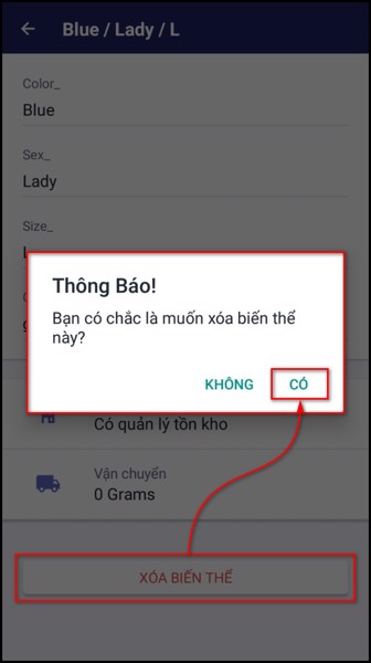 - Nhà bán hàng nhấn chọn nút Xóa biển thể.