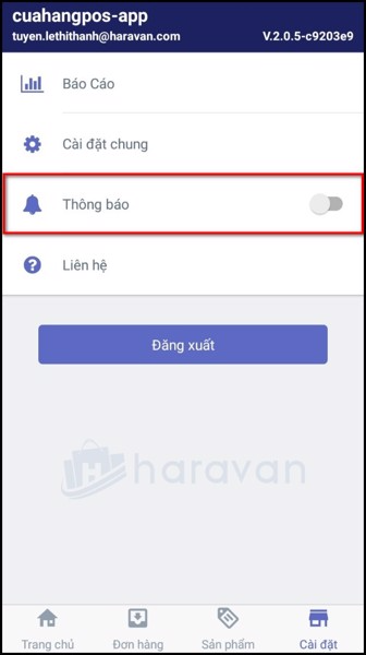 Mục Thông báo cho phép Nhà bán hàng cài đặt việc nhận hoặc không nhận thông báo khi có hoạt động từ ứng dụng.