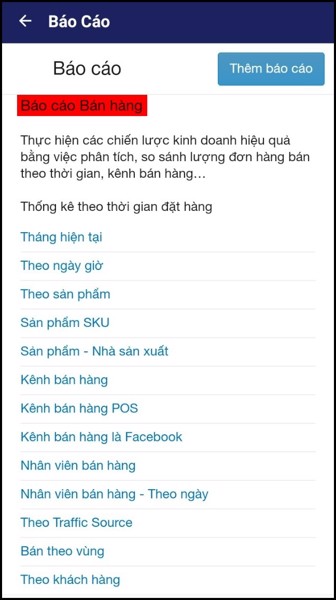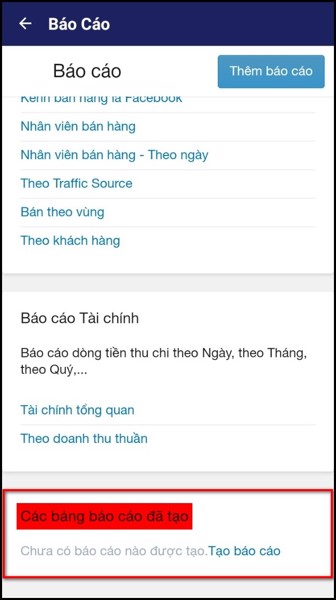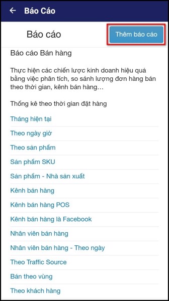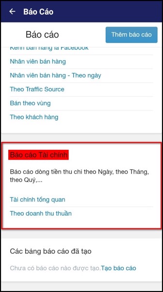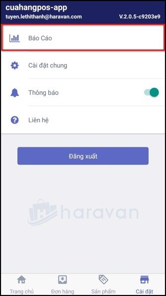 Mục Báo cáo trên thiết bị di động tương đương menu Báo cáo trên Trang quản trị Haravan trên website.