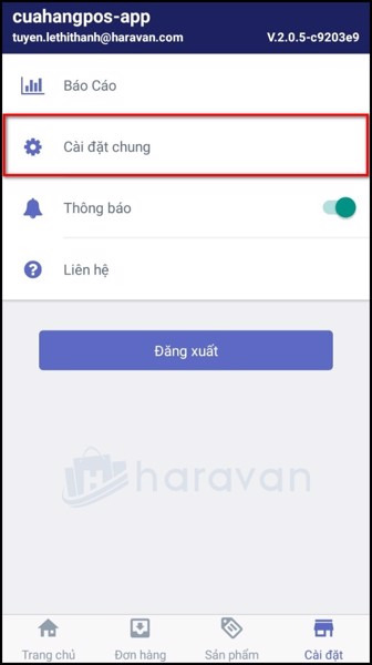 Mục Cài đặt chung tương đương với menu Cấu hình chung trên Trang quản trị Haravan trên website.