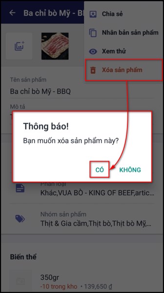Trong trường hợp Nhà bán hàng muốn xóa sản phẩm, Nhà bán hàng chỉ cần nhấp vào Xóa sản phẩm, xác nhận Có trong cửa sổ cảnh báo thì sản phẩm hiện hành sẽ bị xóa trong hệ thống của Nhà bán hàng.