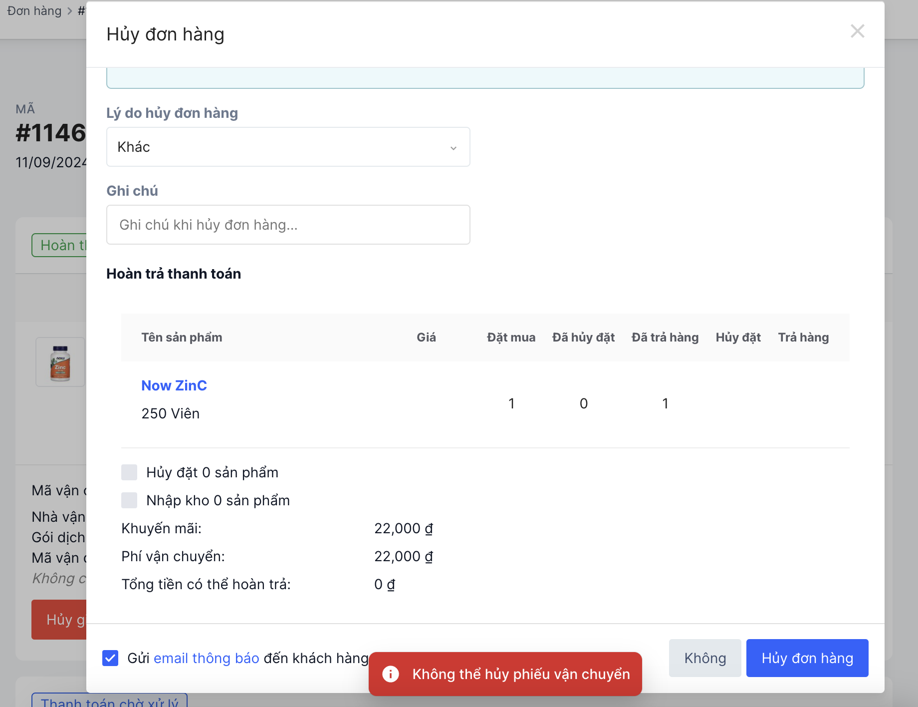 - Chọn Thao tác → Hủy đơn hàng