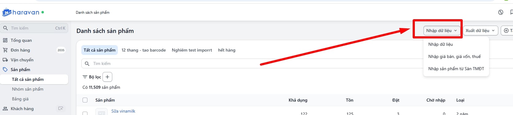 Bước 1: Tại trang quản trị, chọn Sản phẩm-> Tất cả sản phẩm -> chọn Nhập dữ liệu -> chọn Nhập dữ liệu lần nữa