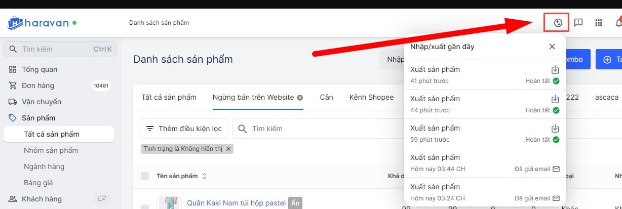 Hệ thống sẽ trả thông tin tại biểu tượng nhập/xuất gần đây tại trang quản trị của bạn