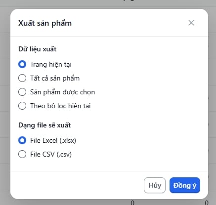 Hướng dẫn thao tác: truy cập trang quản trị, chọn Sản phẩm-> Tất cả sản phẩm -> chọn Xuất dữ liệu -> chọn dữ xuất -> chọn Đồng ý.